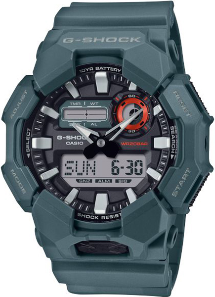 Svetsko vreme 31 vremenska zona (48 gradova + koordinisano univerzalno vreme), letnje računanje vremena uključeno/isključeno, zamena između domaćeg grada i svetskog vremena, jednostavan pristup UTC vremenskoj zoni. Štoperica Štoperica sa preciznošću od 1/100 sekunde. Kapacitet merenja: 23:59’59.99“ Načini merenja: proteklo vreme, deljeno vreme, vremena za 1. i 2. mesto. Ostalo: alarm za ciljno vreme, direktno pokretanje merenja iz načina praćenja vremena. Tajmer Brojač odbrojavanja. Jedinica merenja: 1/10 sekunde. Opseg odbrojavanja: 60 minuta. Opseg postavljanja vremena početka odbrojavanja: od 1 do 60 minuta (u koracima od 1 minute). Alarm/signal za vreme 5 dnevnih alarma (sa jednim alarmom za odlaganje). Signal za vreme svakih sat. Svetlost LED svetlo (Super Illuminator). Selektabilna dužina osvetljenja (1.5 sekundi ili 3 sekunde), nakonosvetlost. Boja svetlosti LED: bela. Kalendar Potpuni automatski kalendar (do 2099. godine). Funkcija isključivanja zvuka Uključivanje/isključivanje zvučnog signala dugmadi. Tačnost Tačnost: ±15 sekundi mesečno. Ostale karakteristike 12/24-satni format. Funkcija pomeranja kazaljki (kazaljke se pomeraju da omoguće nesmetan prikaz digitalnog sadržaja). Redovno praćenje vremena: Analogno: 2 kazaljke (sati, minute – kazaljke se pomeraju svakih 20 sekundi). Digitalno: sati, minute, sekunde, pm, mesec, datum, dan.Dimenzije kućišta (D × Š × V) 55.1 × 51.9 × 17.5 mm Težina 67 g Materijal kućišta i okvira Biološki zasnovani ugljenik / Biološka smola Narukvica Narukvica od biološke smole Izrada Otporan na udarce Struktura sa zaštitom od ugljenika (Carbon Core Guard) Vodootpornost Vodootpornost do 200 metara